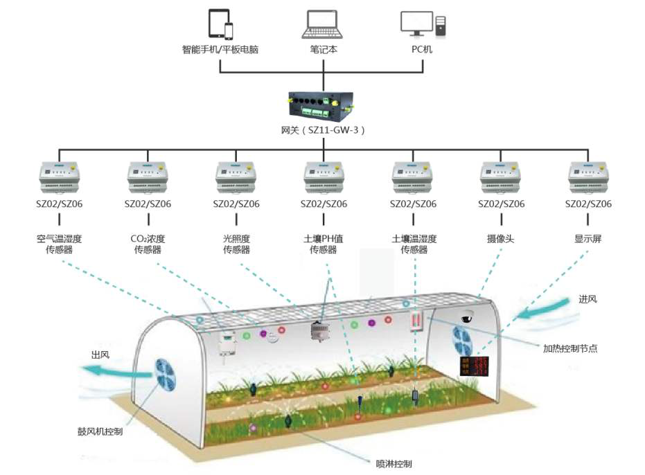 以生態(tài)溫室為例,隨著遠(yuǎn)程監(jiān)控系統(tǒng)、無線傳感器監(jiān)測(cè)等技術(shù)日趨成熟,物聯(lián)網(wǎng)、大數(shù)據(jù)等技術(shù)已逐步應(yīng)用到了生態(tài)農(nóng)業(yè)建設(shè)中。通過環(huán)境、動(dòng)植物信息檢測(cè),溫室農(nóng)業(yè)大棚信息檢測(cè)和標(biāo)準(zhǔn)化生產(chǎn)監(jiān)控,精準(zhǔn)農(nóng)業(yè)中的節(jié)水灌溉等應(yīng)用模式,提高了農(nóng)業(yè)生產(chǎn)的管理效率、提升了農(nóng)產(chǎn)品的附加值、加快了智慧農(nóng)業(yè)的建設(shè)步伐。其主要方式通過安裝于指定的監(jiān)測(cè)點(diǎn)的空氣溫濕度傳感器、土壤溫濕度傳感器、土壤PH傳感器、光合有效輻射傳感器、CO2傳感器等設(shè)備實(shí)時(shí)監(jiān)測(cè)空氣的溫濕度、二氧化碳濃度、土壤溫濕度及PH值等相關(guān)數(shù)據(jù);聯(lián)動(dòng)控制系統(tǒng)由加熱、噴灌、通風(fēng)、卷簾設(shè)備及其配套PLC及Wifi設(shè)備服務(wù)器組成,當(dāng)傳感器采集的環(huán)境數(shù)據(jù)與標(biāo)準(zhǔn)值對(duì)比超出臨界范圍時(shí),控制器自動(dòng)啟動(dòng)相關(guān)硬件設(shè)備對(duì)作物生長(zhǎng)環(huán)境加熱、澆水、通風(fēng)、卷簾加減光照輻射,實(shí)現(xiàn)作物生長(zhǎng)過程精確控制。同時(shí)在塑膜日光溫室旁,建立地下沼氣池,沼氣池上方建圈舍及廁所,形成一個(gè)封閉的智慧化能源生態(tài)系統(tǒng)。在此系統(tǒng)內(nèi),圈舍溫度在冬天提高3~5℃,為禽畜提供了更適宜的生長(zhǎng)條件,使豬的生長(zhǎng)期大幅縮短約150天。禽畜糞便為沼氣池提供原料,產(chǎn)出的沼氣用于家庭供暖,殘留的沼渣、沼液作為溫室作物的肥料。此外,豬等禽畜呼吸排出的CO2可促進(jìn)溫室內(nèi)作物光合作用,蔬菜產(chǎn)量和質(zhì)量明顯提高。