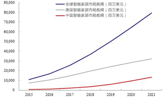 近年來智能家居市場進入快速拓展期,用戶滲透率快速增長。根據(jù)調(diào)查數(shù)據(jù)顯示,2017 年美國智能家居市場規(guī)模將達 146 億美元,滲透率提升至 32.5%,預計 2021 年將達到 60.7%。而中國智能家居市場規(guī)模也超過 20 億美元, 滲透率為 2.6%,與美國相比差距較大,未來發(fā)展空間廣闊。隨著語音識別技術(shù)不 斷成熟,智能音箱作為語音交互載體,在控制智能家居的便捷度和體驗上都將逐 步優(yōu)于智能手機。未來智能音箱有望成為智能家居的控制中樞,成為一個開放性的平臺,可以讓客廳的智能電視、電燈、空調(diào)等鏈接起來,通過語音交互來實現(xiàn)對于其他智能家居產(chǎn)品的控制,掌握了智能音箱便掌握了智能家居的入口。