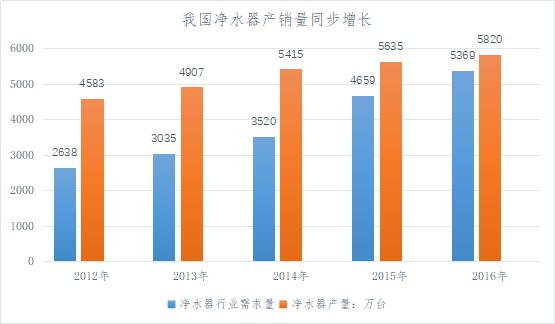 2012 年以來(lái),我國(guó)凈水器的產(chǎn)銷(xiāo)量逐年增長(zhǎng),市場(chǎng)需求不斷擴(kuò)大。2016 年,凈水器產(chǎn)量達(dá)到 1,347.8 萬(wàn)臺(tái),銷(xiāo)量為 1,353.4 萬(wàn)臺(tái)。從 2014 年開(kāi)始,凈水器產(chǎn)銷(xiāo)量增速雙雙放緩,市場(chǎng)進(jìn)入調(diào)整期。相對(duì)于整個(gè)家電行業(yè)而言,凈水器市場(chǎng)仍然維持著較高增速,市場(chǎng)潛力較大,競(jìng)爭(zhēng)激烈。