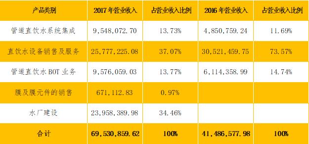 公司的主營(yíng)業(yè)務(wù)為管道直飲水系統(tǒng)BOT業(yè)務(wù)、管道直飲水系統(tǒng)集成、直飲水設(shè)備的生產(chǎn)、銷(xiāo)售及服務(wù),其收入按產(chǎn)品類(lèi)別列示如下: