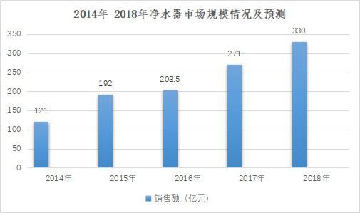 我國(guó)凈水器市場(chǎng)尚未完全開(kāi)發(fā),目前我國(guó)凈水器市場(chǎng)覆蓋率僅5%,而韓國(guó)的市場(chǎng)覆蓋率高達(dá)95%。這其中,蘊(yùn)含著巨大的商機(jī),未來(lái)凈水器市場(chǎng)可以發(fā)展成上千億乃至更多的產(chǎn)業(yè)。根據(jù)中商產(chǎn)業(yè)研究院發(fā)布的《2018-2023年中國(guó)凈水器市場(chǎng)前景及投資機(jī)會(huì)研究報(bào)告》數(shù)據(jù)顯示,2016年中國(guó)凈水器銷(xiāo)售規(guī)模為203.5億元,同比增長(zhǎng)40.6%;2017年中國(guó)凈水器市場(chǎng)規(guī)模達(dá)271億元,同比增長(zhǎng)33.2%,其中線(xiàn)上可達(dá)213億元,線(xiàn)下可達(dá)58億元。同時(shí),在2018年中國(guó)凈水器銷(xiāo)售規(guī)?;?qū)⑼黄?30億元。
