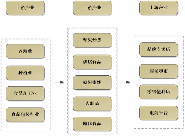 休閑食品行業(yè)的上游行業(yè)包括傳統(tǒng)農(nóng)業(yè)如種植業(yè)、養(yǎng)殖業(yè)、,食品添加劑、食品包裝行業(yè)。行業(yè)的下游主要是銷售環(huán)節(jié),通過多種渠道如大型商超、直營店、經(jīng)銷商等進(jìn)行銷售,直面產(chǎn)品終端消費(fèi)者。