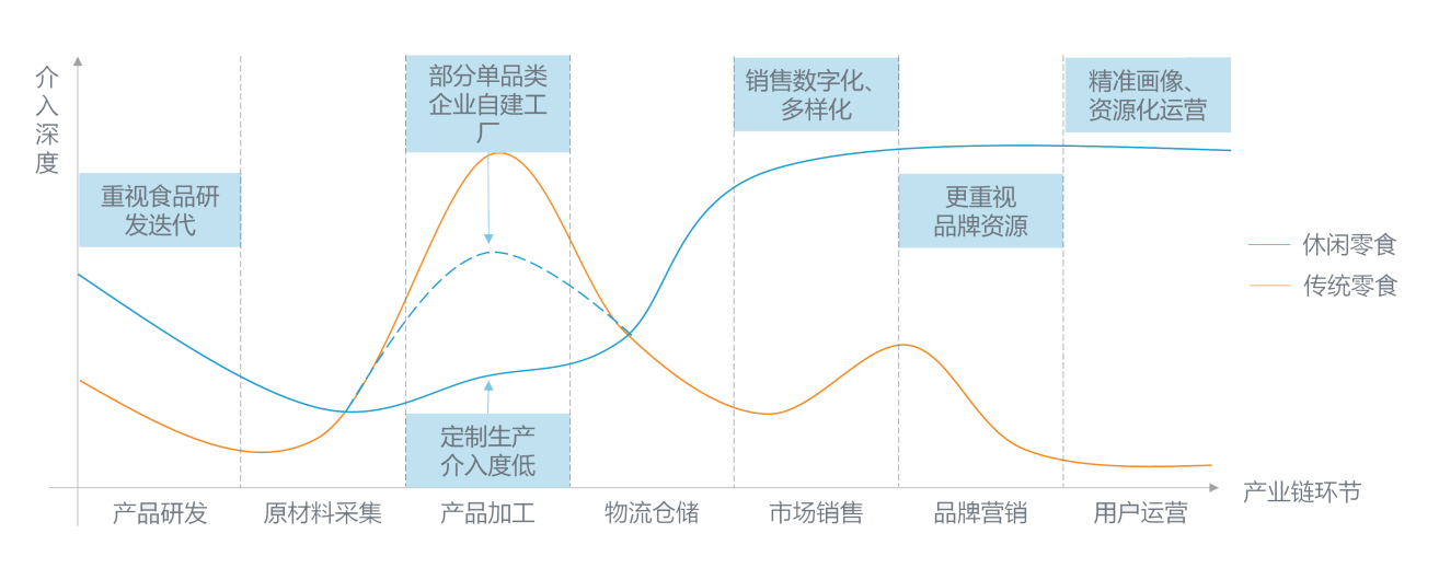 目前,市場上對休閑零食的劃分有五至十二個(gè)品類,每個(gè)品類之中又包含若干子品類,導(dǎo)致休閑零食的市場碎片化嚴(yán)重;傳統(tǒng)食品企業(yè)跨品類經(jīng)營意味著重新購置、配置一條生產(chǎn)線,成本巨大;同時(shí),部分休閑零食企業(yè)采用對外合作定制生產(chǎn)策略,僅發(fā)力于食品研發(fā)環(huán)節(jié),一定程度上改進(jìn)了以往重資產(chǎn)企業(yè)跨品類難度大的問題,孕生了平臺(tái)型、多品類經(jīng)營新業(yè)態(tài)。
