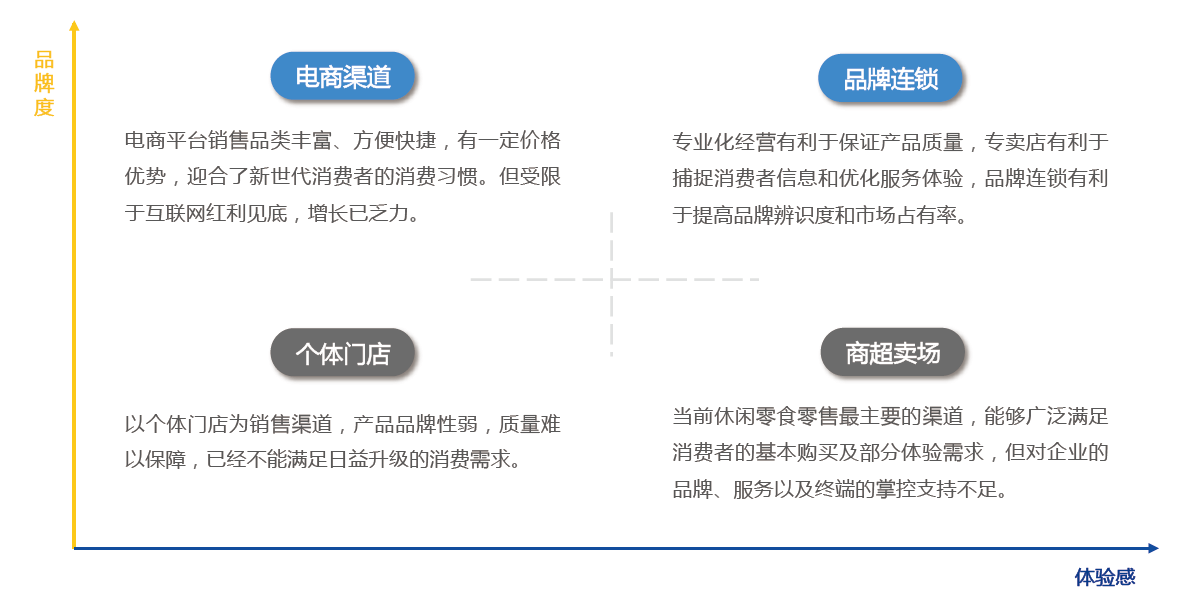 休閑零食的渠道陣營主要有四大類:傳統(tǒng)的個(gè)體門店和商超賣場,新興的品牌連鎖和電商渠道。在新零售浪潮的沖擊下,四大陣營此消彼長,個(gè)體門店的市場份額不斷縮減,商超賣場的渠道影響力也將減弱,品牌連鎖和電商渠道將成為未來休閑零食新消費(fèi)的主流渠道。