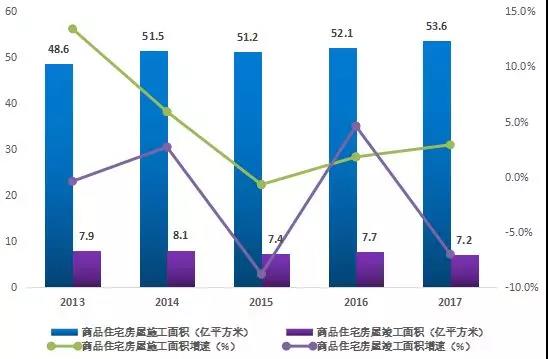 2013-2017年中國(guó)商品住宅房屋施工面積和竣工面積