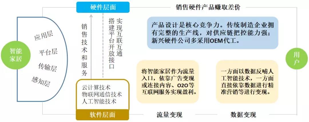 將智能家居劃分為硬件和軟件兩個(gè)層面,其中硬件對(duì)應(yīng)于智能家居的應(yīng)用層,軟件對(duì)于智能家居的平臺(tái)層、傳輸層和感知層。硬件產(chǎn)品的品牌方專注于產(chǎn)品側(cè)的設(shè)計(jì)和制造,向終端用戶提供的是智能家居的物理屬性,通過(guò)銷售硬件賺取差價(jià)實(shí)現(xiàn)盈利。針對(duì)智能家用產(chǎn)品的云計(jì)算、物聯(lián)網(wǎng)通信和人工智能三項(xiàng)核心技術(shù),技術(shù)供應(yīng)商通常會(huì)提供其中的一項(xiàng)或多項(xiàng)能力。他們既可以選擇直接通過(guò)向硬件廠商銷售技術(shù)和服務(wù)變現(xiàn),也可以選擇以硬件產(chǎn)品連接到海量的終端用戶,利用獲取到的用戶流量和數(shù)據(jù),通過(guò)面向消費(fèi)者的互聯(lián)網(wǎng)服務(wù)和面向企業(yè)的數(shù)據(jù)服務(wù)進(jìn)行變現(xiàn)。