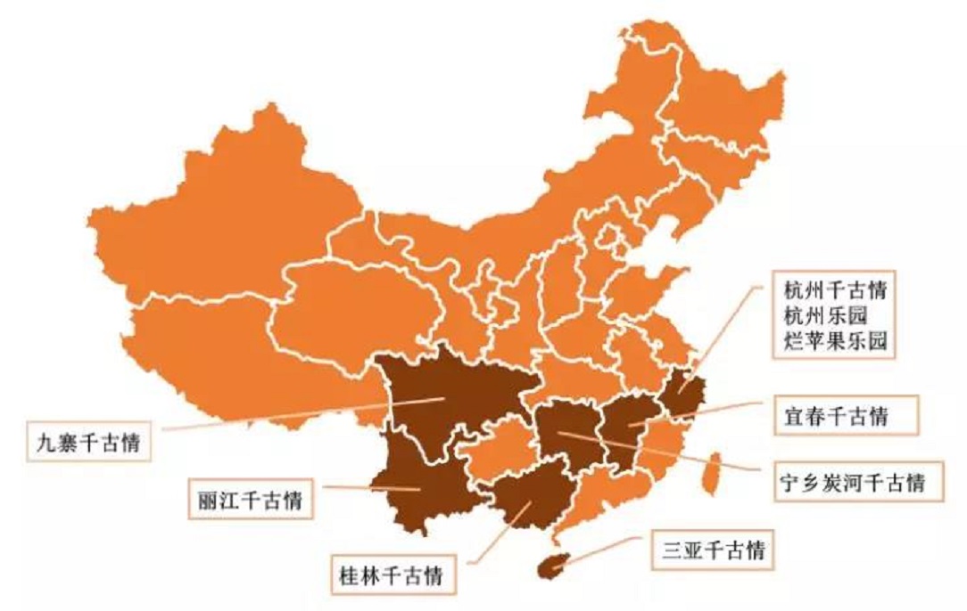 宋城演藝的主題公園主要布局在旅游發(fā)達城市和地區(qū),目前有9個主題公園,包括7個千古情景區(qū),布局城市包括一線旅游城市杭州、三亞、麗江、九寨、桂林,也在二三線旅游城市如寧鄉(xiāng)、宜春進行輕資產(chǎn)布局。