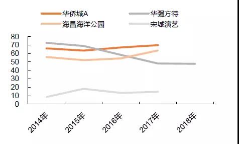 華僑城和海昌海洋公園均有地產(chǎn)開發(fā)業(yè)務(wù),其中華僑城以房地產(chǎn)收入為主,2018年上半年旅游業(yè)務(wù)收入占比32%;海昌海洋公園地產(chǎn)收入占比很低,且近年來聚焦主題公園業(yè)務(wù),地產(chǎn)收入占比明顯下降,從2010年的52%降低到2018年上半年的7%,主題公園營運收入占比達93%。