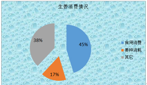 圖2為我國生姜市場消費(fèi)情況。總的看來,生姜消費(fèi)需求相對穩(wěn)定,2016年1654萬噸,同比增長8.4%,各類消費(fèi)合計(jì)838萬噸。其中,食用消費(fèi)380萬噸,姜種消耗139萬噸。