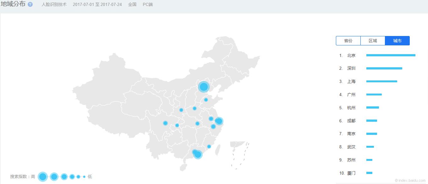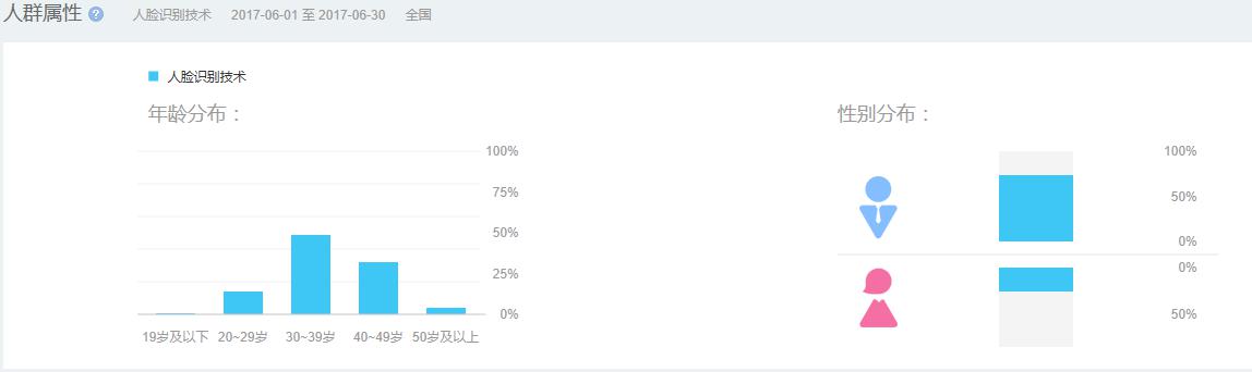 根據(jù)百度數(shù)據(jù)顯示,市場對于人臉識別技術(shù)的關(guān)注度,根據(jù)地域分布,主要集中在北京、深圳、上海、廣州、杭州等城市;根據(jù)年齡和性別分布,主要集中在男性青年群體。