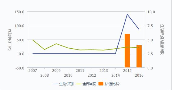 在2014年以前,人臉識別技術(shù)所屬的生物識別行業(yè)市盈率PE低于全部A股PE,其值在0附近;2014年至2016年,生物識別行業(yè)PE高于全部A股均值,并在2015年接近150%,被市場看好。