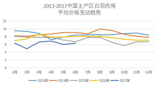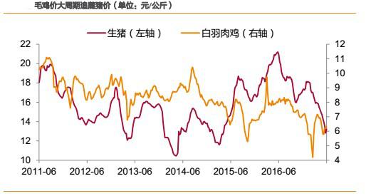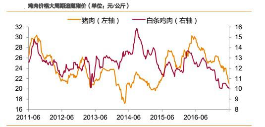 2)短周期內(nèi),受各自供求關(guān)系決定產(chǎn)品價(jià)格,則豬價(jià)、雞價(jià)走勢(shì)有可能會(huì)發(fā)生背離,但背離時(shí)間一般不會(huì)超過1個(gè)季度,且背離的時(shí)間一般出現(xiàn)在春節(jié)后的上半年。如2012年2月-4月,2014年2月-4月、2015 年3月-6月、2016年3月-6月、2017年2月-3月。