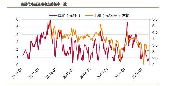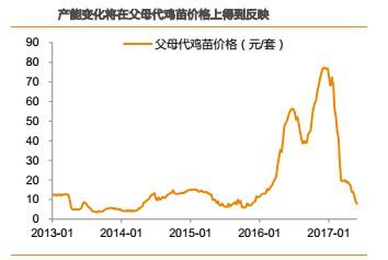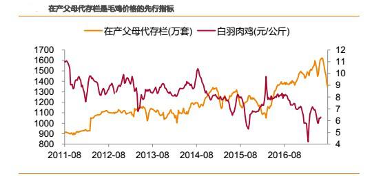 引種規(guī)模的下降意味著祖代存欄的下降,供給的減少將導(dǎo)致父母代雞苗銷售價(jià)格下降。由于2012年以前國(guó)內(nèi)白羽肉雞需求快速增加,因此,國(guó)內(nèi)白羽雞引種規(guī)增速的下降也會(huì)引起價(jià)格的上漲。例如,2010年的引種規(guī)模與2009年基本持平,僅增長(zhǎng)3萬套。受此影響,父母代雞苗價(jià)格也從2010年9月份開始反彈。同樣的,隨著2014年引種規(guī)模的下降,父母代雞苗價(jià)格則從2014年3月見底回升,中間雖有波動(dòng),但從2015年10月即開始一輪快速上漲。也就是說,對(duì)于祖代產(chǎn)能的變化,父母代雞苗價(jià)格是一個(gè)重要的驗(yàn)證指標(biāo)。