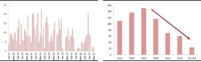 2015年以來,祖代雞引種在持續(xù)收縮過程中,總量上基本得到了控制。美國(guó)、法國(guó)、西班牙等重要引種來源國(guó)相繼被封關(guān),目前可以引種的國(guó)家十分有限。2017年上半年各品種共引進(jìn)23萬套,比去年同期多出12萬套,主要是集中在今年1/2月份。