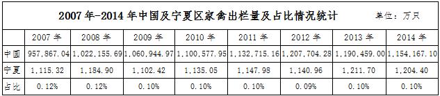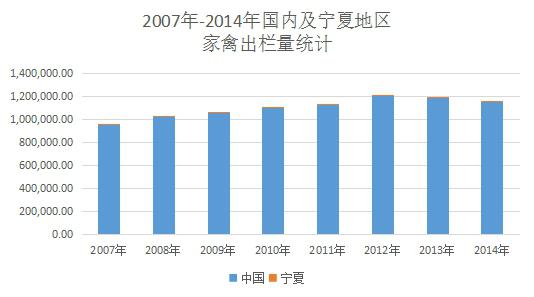 依據(jù)wind數(shù)據(jù),2014年全國(guó)家禽出欄量1154167.1萬只,寧夏地區(qū)家禽出欄量達(dá)1204.4萬只,占全國(guó)出欄量的0.1%。自2007年以來,寧夏地區(qū)的家禽出欄量一直以0.1%~0.12%的全國(guó)占比,市場(chǎng)占比非常小。