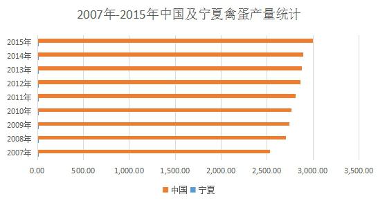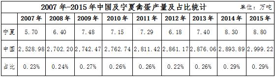 寧夏不僅是在出欄量上所占比重較低,在產(chǎn)量上也并不樂觀。2015年底,中國(guó)總體禽蛋產(chǎn)量為2999.22萬噸,而寧夏僅8.8萬噸,占全國(guó)的0.29%。2007年以來,寧夏禽蛋產(chǎn)量占比在0.23%~0.29%之間,2014年占比達(dá)到最高。