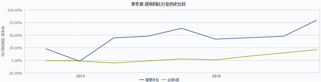 根據(jù)圖1數(shù)據(jù)顯示,從2015年第一季度到2017年第二季度,與全部A股相比,健康體檢行業(yè)的單季度營(yíng)收同比總體處于較高水平,并表現(xiàn)為波動(dòng)增長(zhǎng)的趨勢(shì)。