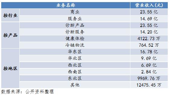 如圖9、10、11是迪安診斷的營(yíng)業(yè)收入構(gòu)成。按行業(yè)分,營(yíng)業(yè)收入中,服務(wù)業(yè)占比38.42%,商業(yè)占比61.58%;按產(chǎn)品分,營(yíng)業(yè)收入中,診斷產(chǎn)品占比61.58%,診斷服務(wù)占比37.14%,健康體檢占比1.08%,冷鏈物流占比0.20%;按地區(qū)分布,營(yíng)業(yè)收入中,華東區(qū)、華北區(qū)、西北區(qū)、西南區(qū)、東北區(qū)、其他分別占比為43.87%、25.33%、17.50%、7.43%、2.61%、3.26%。