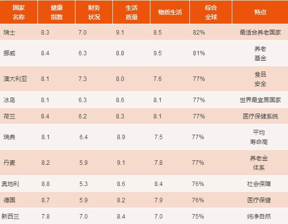 法盛全球資產(chǎn)管理公司(Natixis Global Asset Management),根據(jù)世界銀行、世界衛(wèi)生組織等提供的數(shù)據(jù),從醫(yī)療環(huán)境、預(yù)期壽命、金融穩(wěn)定和生活質(zhì)量等20個方面,綜合比較了全球150個國家的養(yǎng)老情況,評出了前十名: