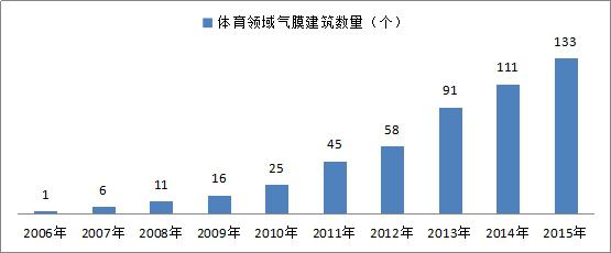 目前,世界上已經(jīng)建成有上萬個(gè)氣膜建筑了,2011年以后中國氣膜場(chǎng)地的數(shù)量迎來集中爆發(fā)期,全國每年新增項(xiàng)目數(shù)量基本穩(wěn)定在30個(gè)以上。截至2015年末,我國氣膜建筑總項(xiàng)目數(shù)達(dá)到215個(gè),建筑面積達(dá)到88.76萬平方米;其中,現(xiàn)存的項(xiàng)目數(shù)量和建筑面積分別為197個(gè)和78.60萬平方米,現(xiàn)存率在90%左右。氣膜建筑可以應(yīng)用的范圍非常廣闊,但是我國目前還是作為運(yùn)動(dòng)場(chǎng)館的比較多,市場(chǎng)接受度也比較高。隨著社會(huì)對(duì)環(huán)保的關(guān)注,企業(yè)經(jīng)營過程中環(huán)保的成本要求越來越高,未來在工業(yè)領(lǐng)域,氣膜建筑還有更廣泛的應(yīng)用。