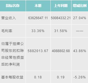 維拓環(huán)境2016年?duì)I業(yè)收入為50452048.01元,增長(zhǎng)85.36%;毛利潤為31.82%;歸屬于掛牌公司股東的扣除非經(jīng)常性損益后的凈利潤為2701722.12元,增長(zhǎng)137.51%;基本每股收益為0.24元,增長(zhǎng)137.50%。