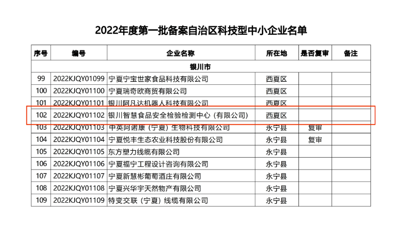 近日,自治區(qū)科技廳發(fā)布了《關于2022年度第一批備案自治區(qū)科技型中小企業(yè)的公告》,銀川匯創(chuàng)資本投資控股有限公司旗下銀川智慧食品安全檢驗檢測中心(有限公司)備案為自治區(qū)科技型中小企業(yè)。