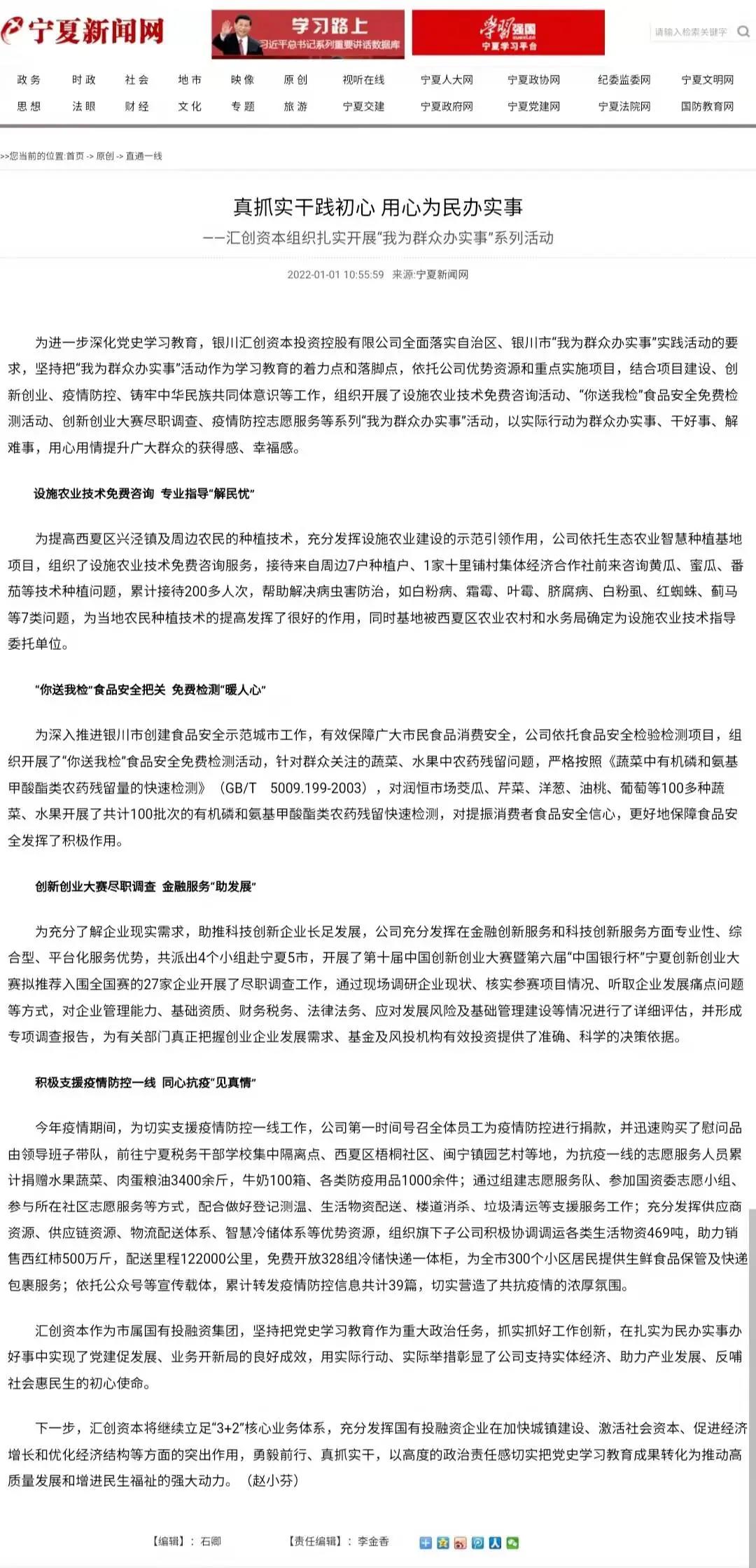 為進(jìn)一步深化黨史學(xué)習(xí)教育,匯創(chuàng)資本全面落實(shí)自治區(qū)、銀川市“我為群眾辦實(shí)事”實(shí)踐活動(dòng)的要求,堅(jiān)持把“我為群眾辦實(shí)事”活動(dòng)作為學(xué)習(xí)教育的著力點(diǎn)和落腳點(diǎn),依托公司優(yōu)勢(shì)資源和重點(diǎn)實(shí)施項(xiàng)目,結(jié)合項(xiàng)目建設(shè)、創(chuàng)新創(chuàng)業(yè)、疫情防控、鑄牢中華民族共同體意識(shí)等工作,組織開展了設(shè)施農(nóng)業(yè)技術(shù)免費(fèi)咨詢活動(dòng)、“你送我檢”食品安全免費(fèi)檢測(cè)活動(dòng)、創(chuàng)新創(chuàng)業(yè)大賽盡職調(diào)查、疫情防控志愿服務(wù)等系列“我為群眾辦實(shí)事”活動(dòng),以實(shí)際行動(dòng)為群眾辦實(shí)事、干好事、解難事,用心用情提升廣大群眾的獲得感、幸福感,獲得了寧夏新聞網(wǎng)宣傳報(bào)道。